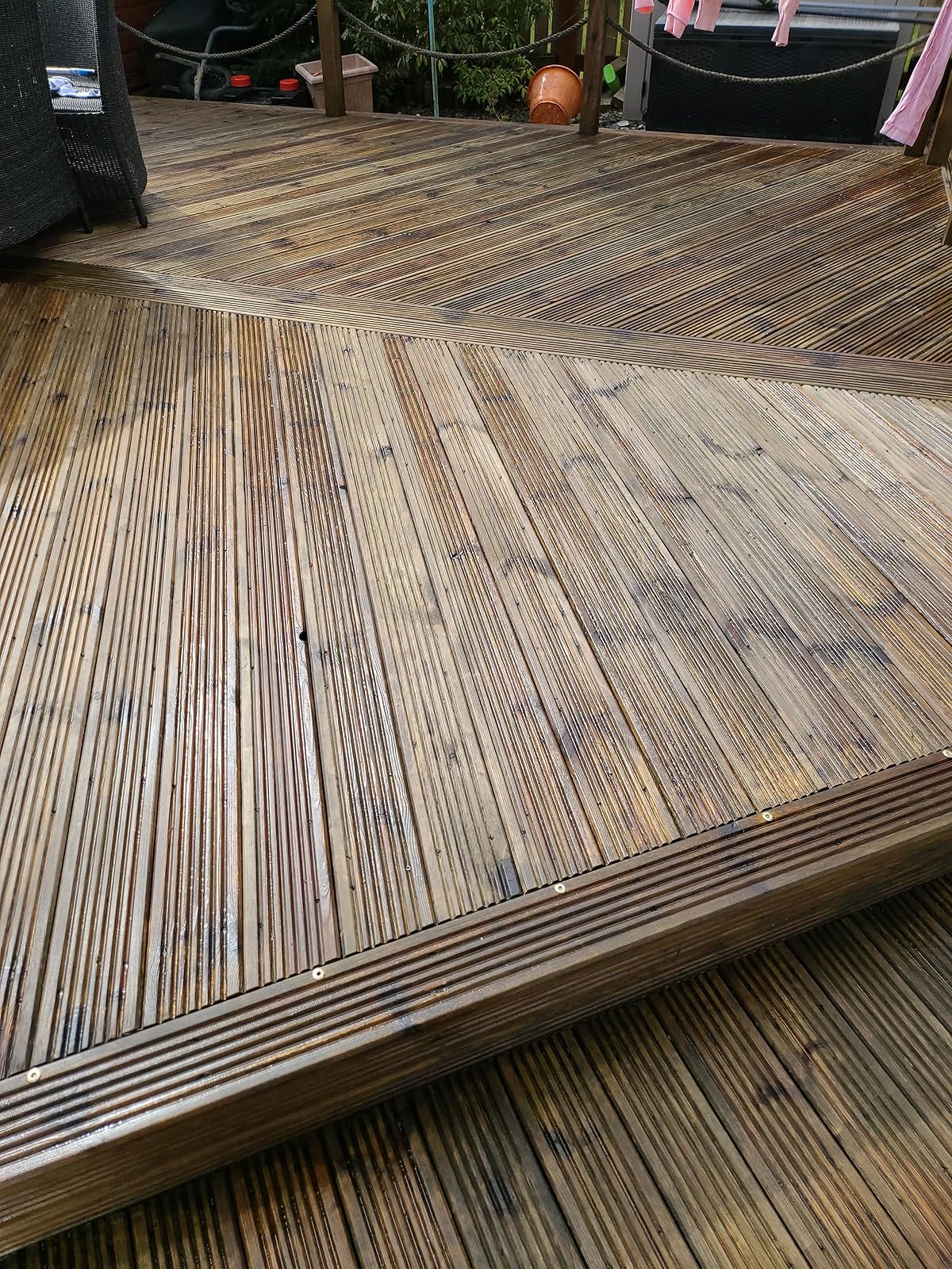 The pressure washer route takes about an hour on anything up to 10m2 if you keep at it. The result though is wood back to new, like the day it was installed.